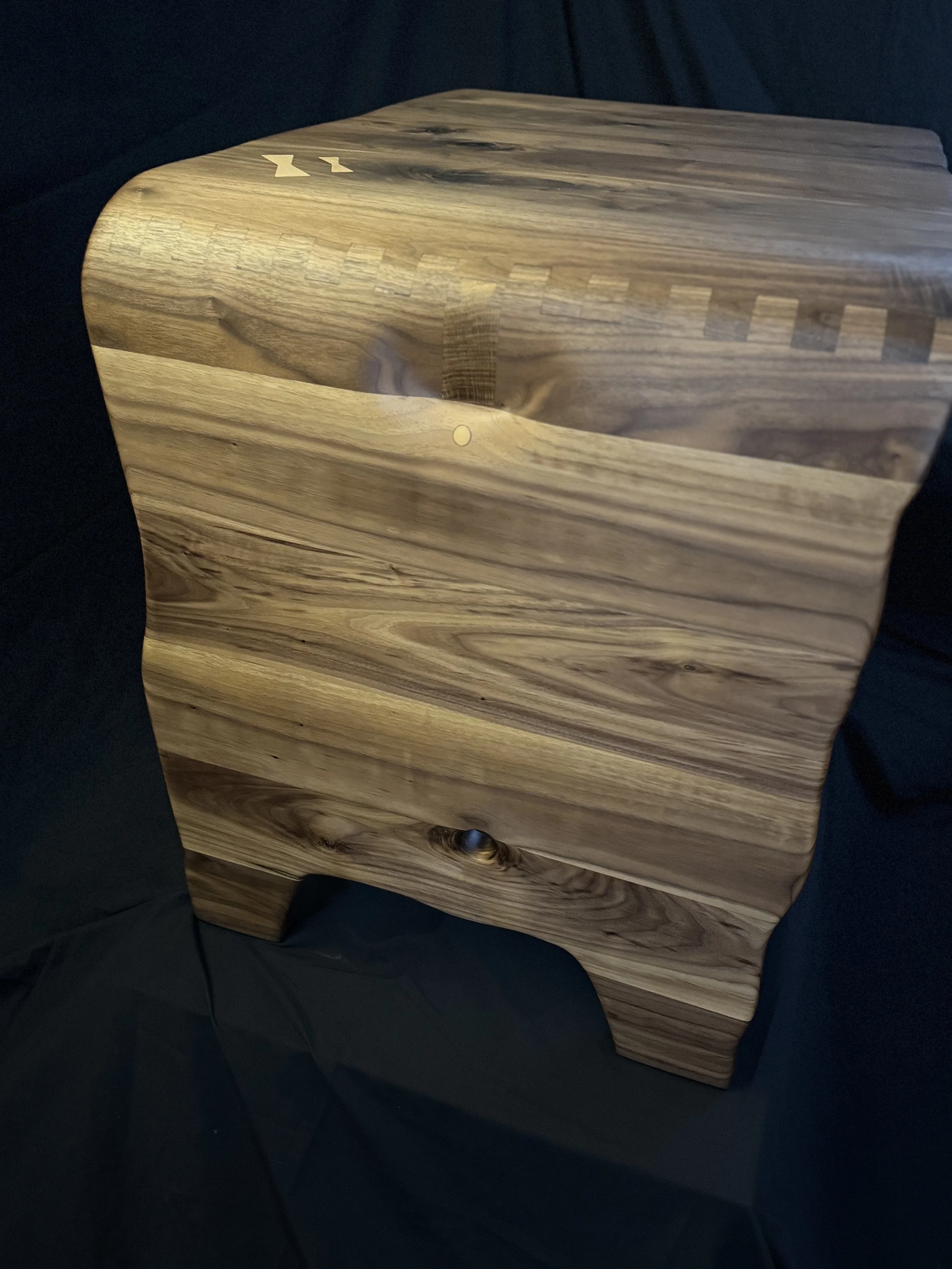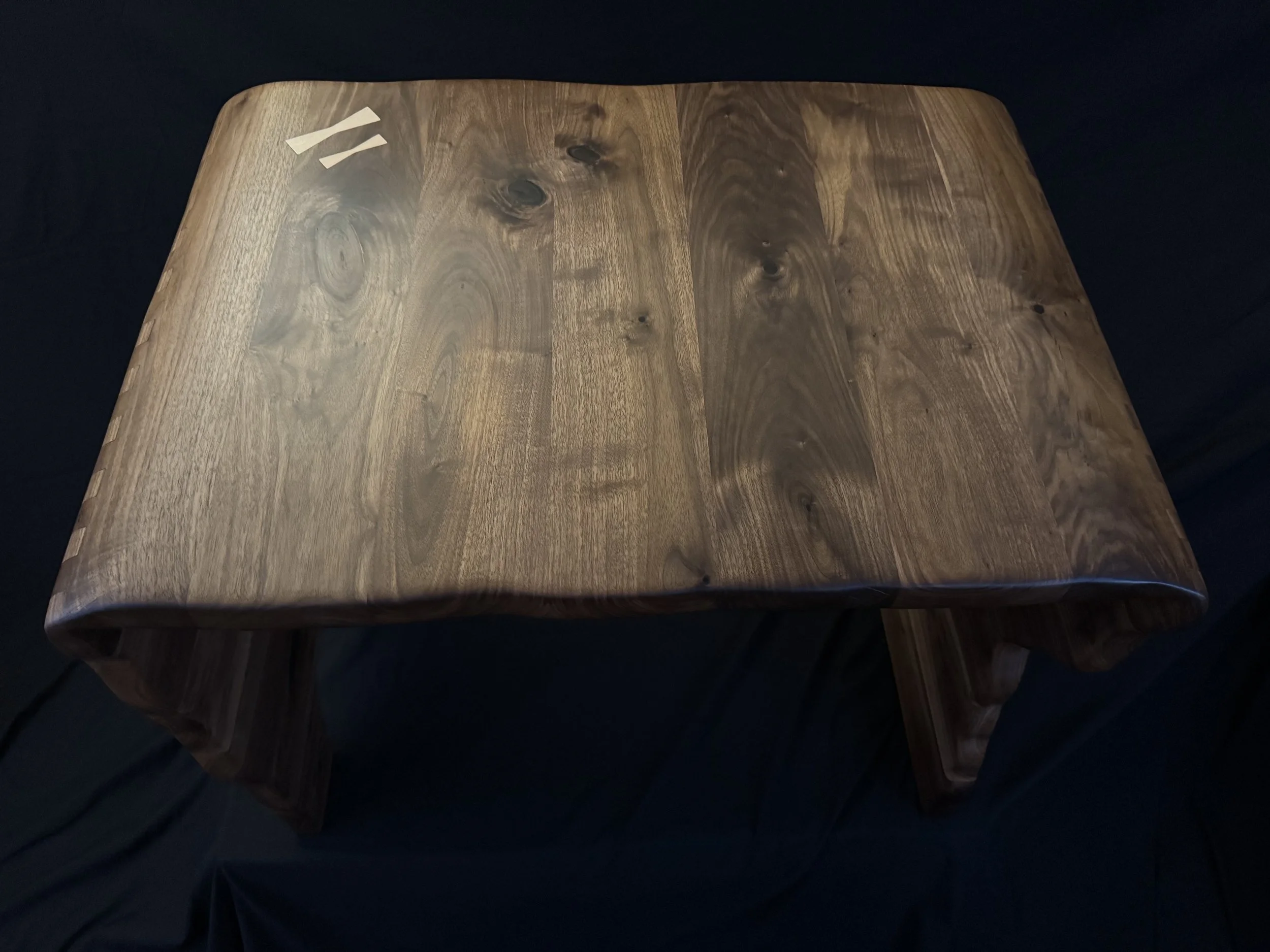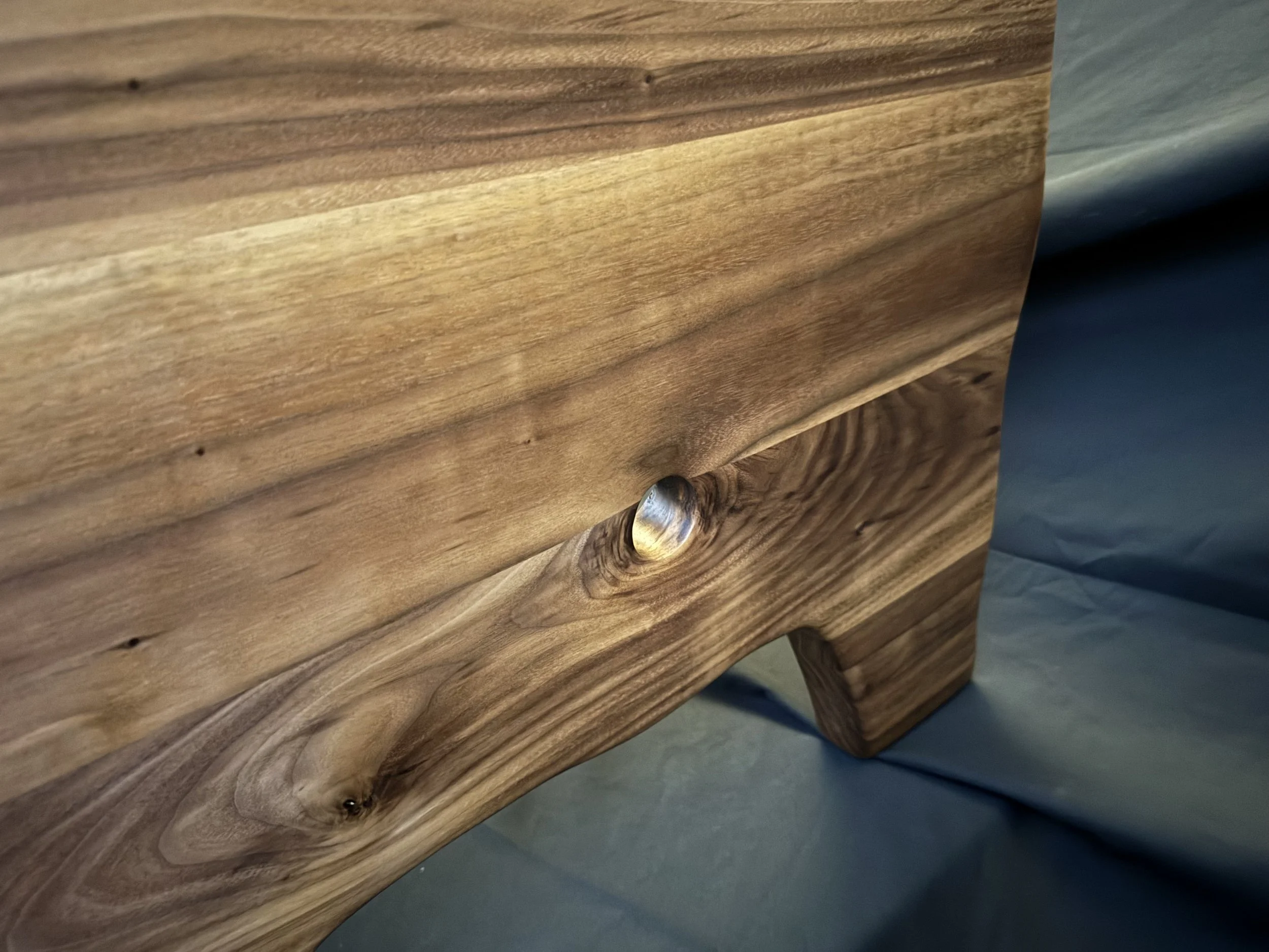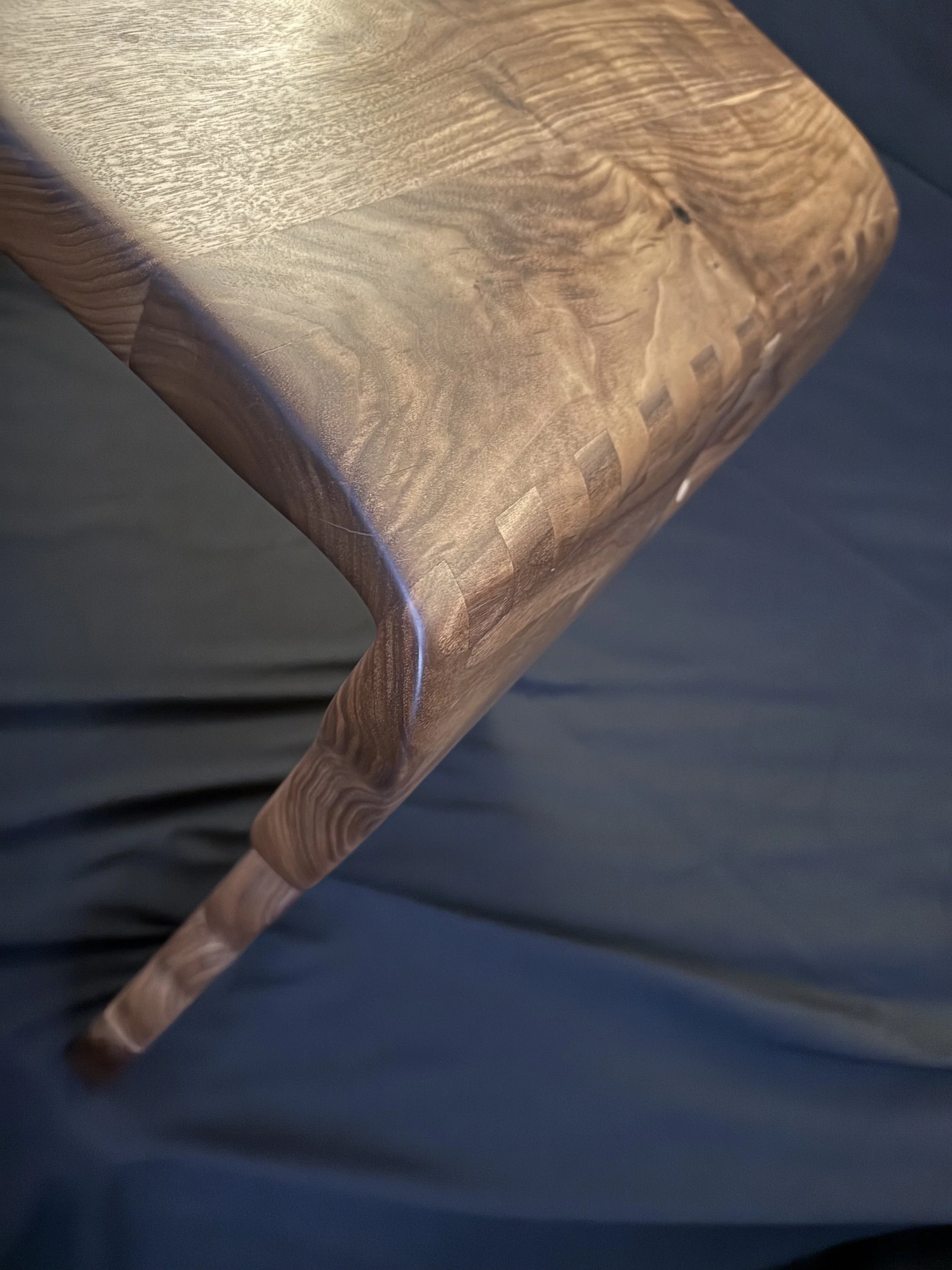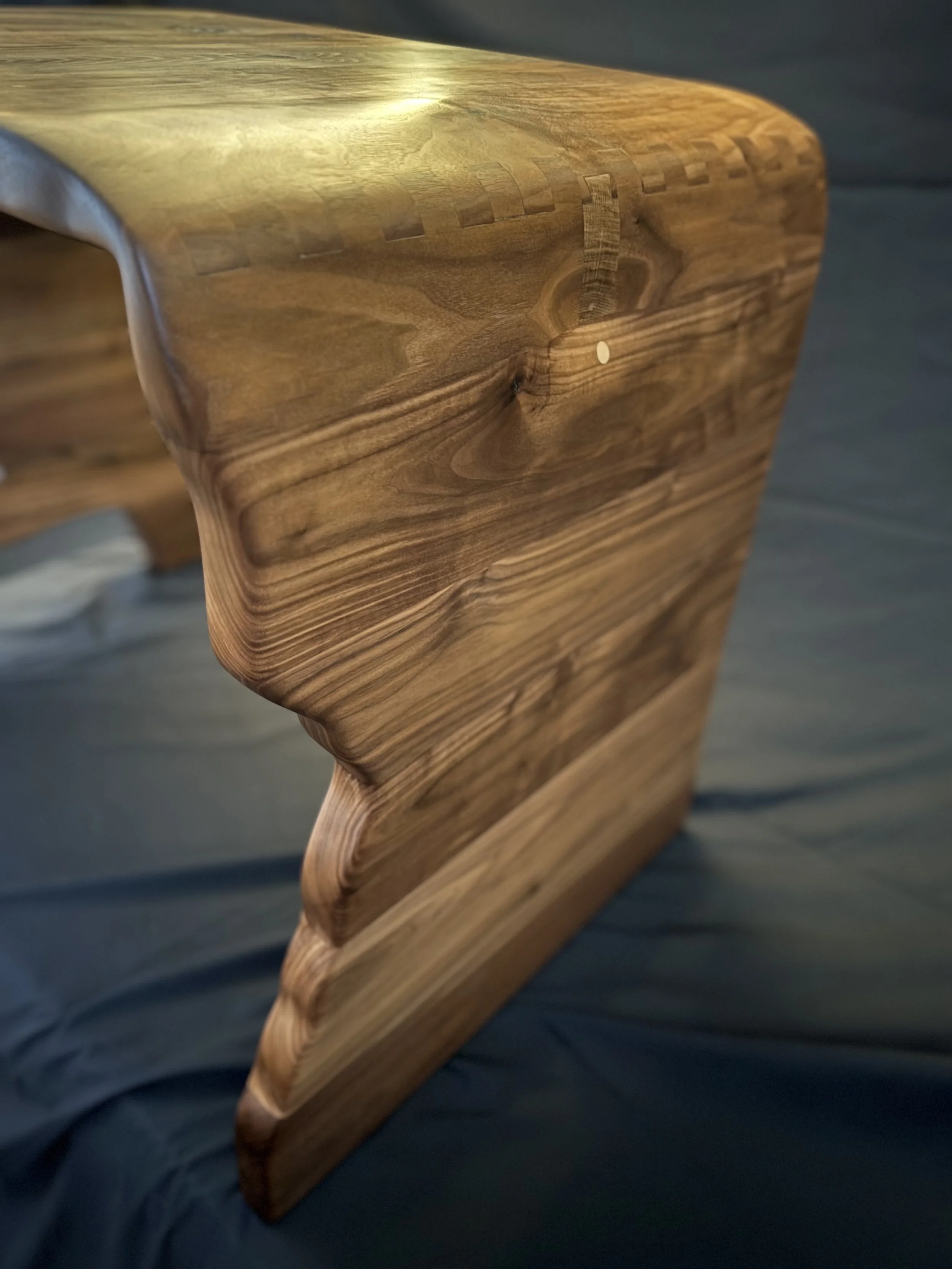 This custom Walnut desk was designed as a gift for my wife — a compact, elegant piece meant to live a full second life as our child’s first real workspace. It features a waterfall edge design with a twist (literally), a dovetailed White Oak support rail, and bowtie inlays added purely for beauty — because to me, bowties are the jewelry of woodworking.