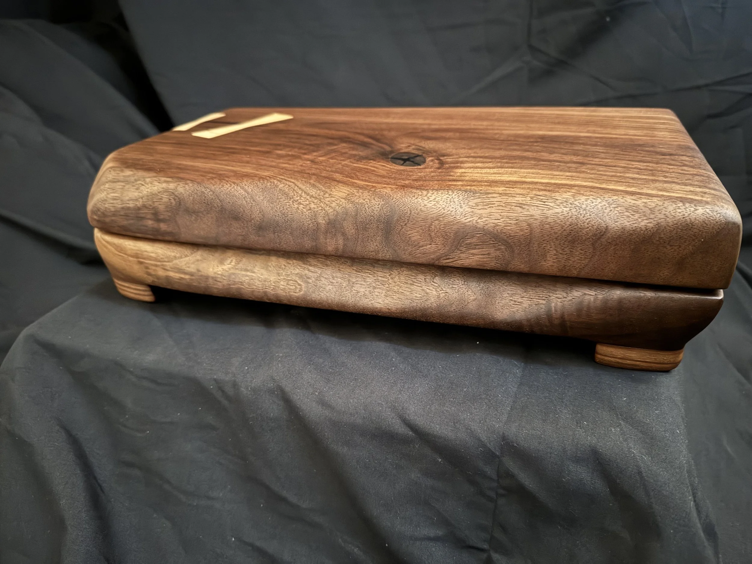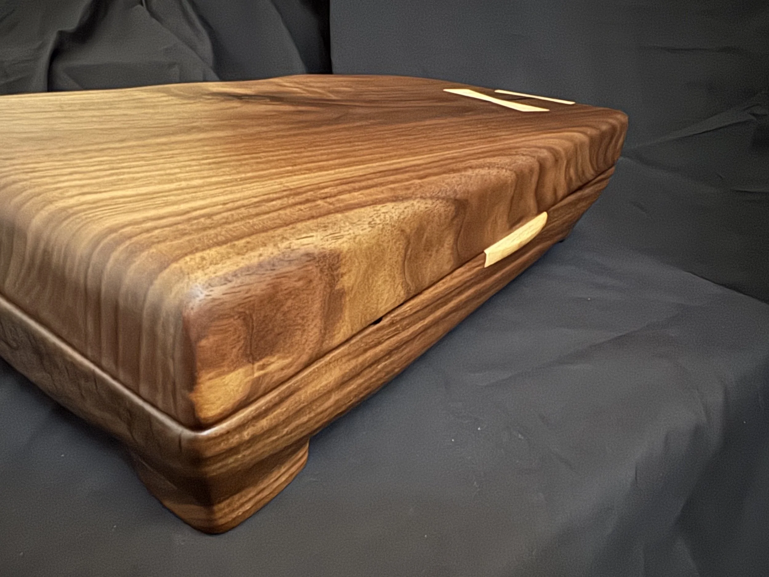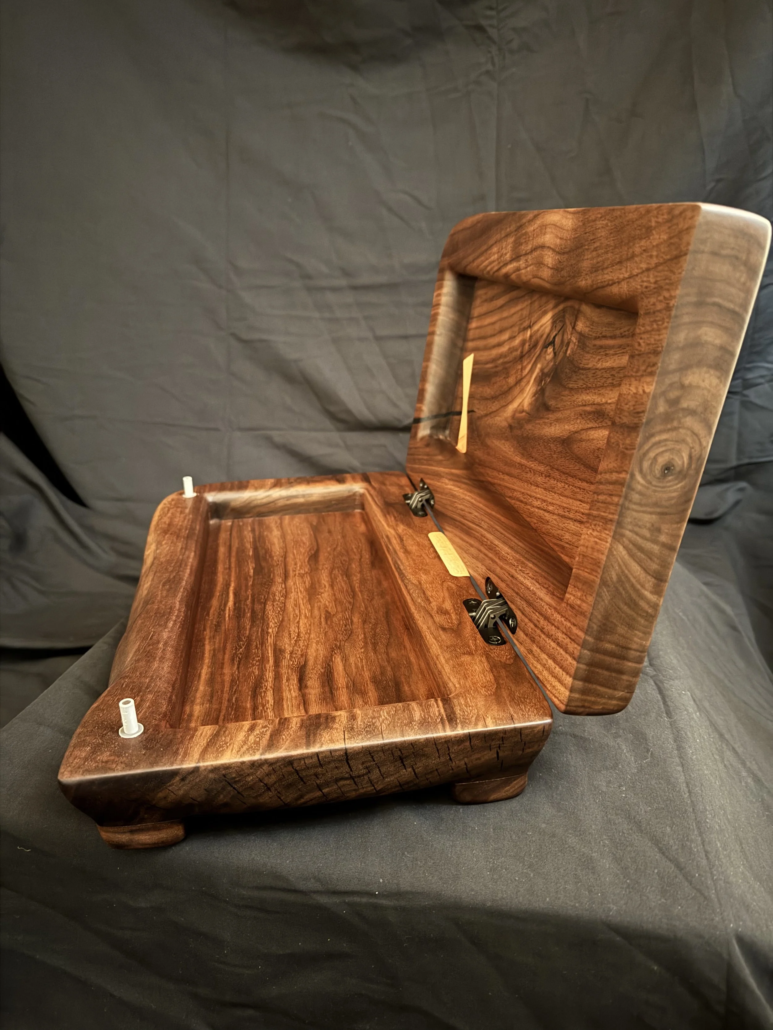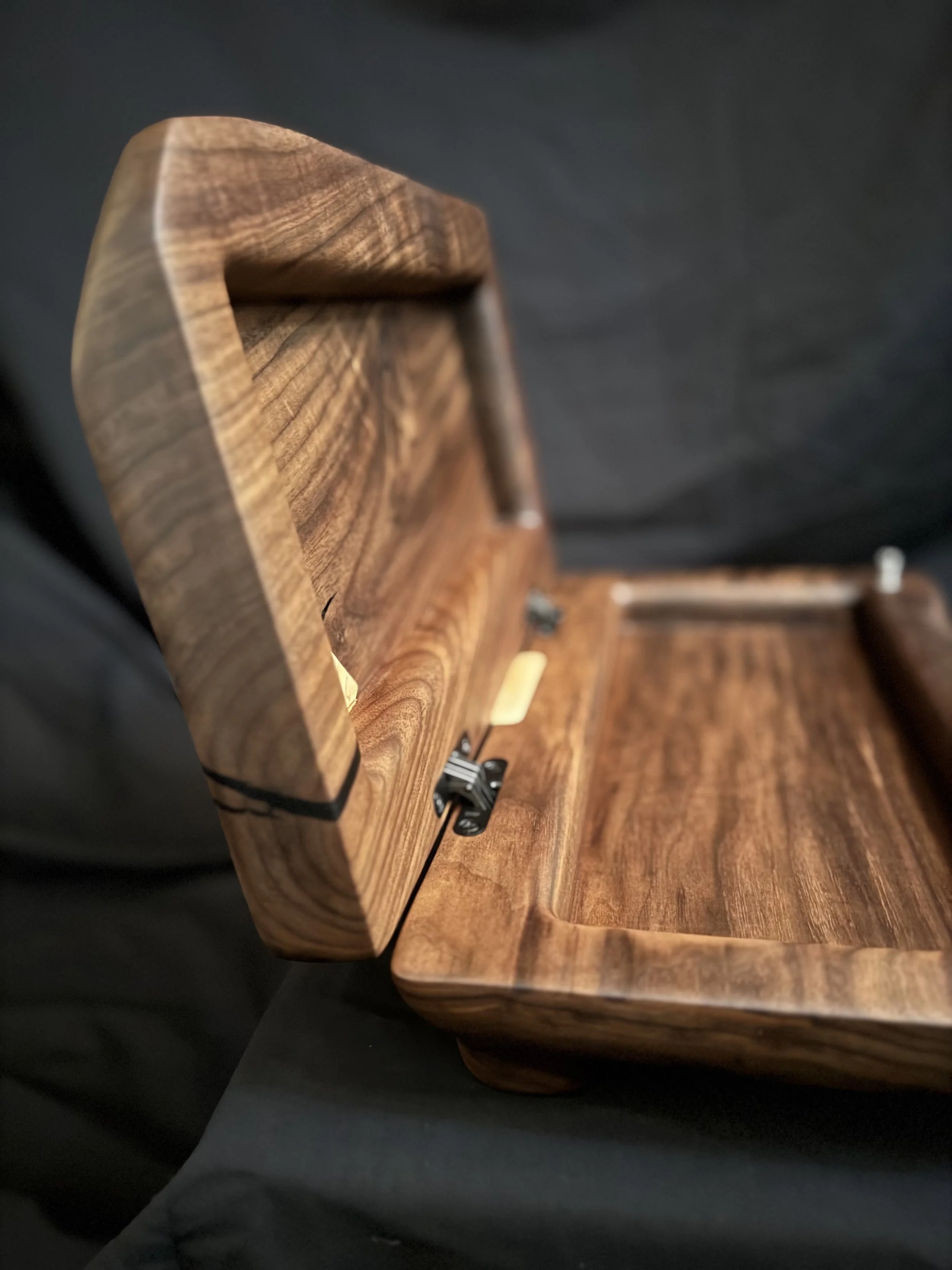 This walnut box build breaks all the usual woodworking rules. Instead of traditional joinery, I hollowed the box and lid out of 8/4 walnut, added SOSS invisible hinges, experimented with a through bowtie (with questionable grain orientation), and even cobbled together a lid stop from an off cut of maple.